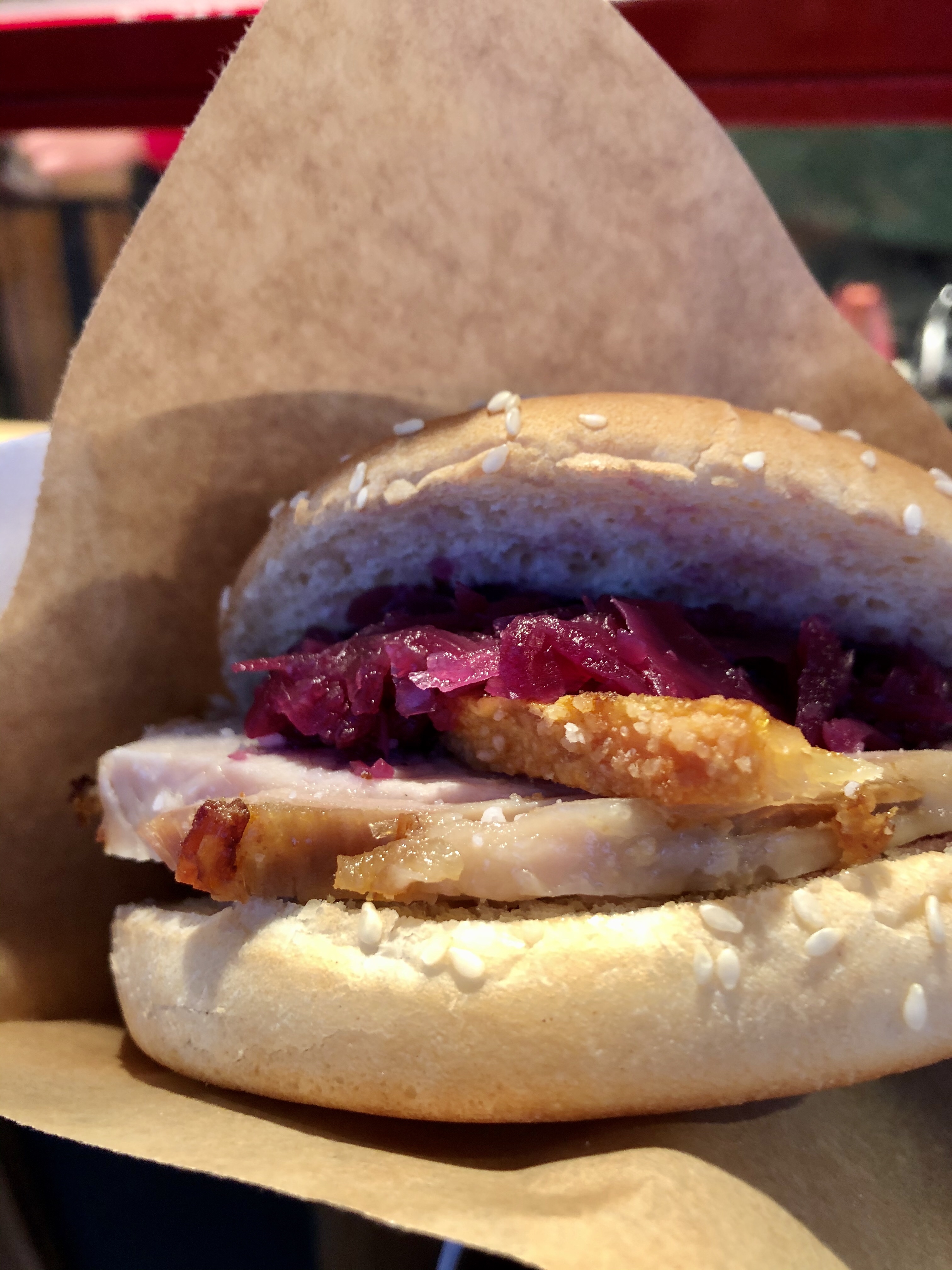 - Christmas Markets: Pork rolls filled with juicy pork, crispy pork crackling, red cabbage always go down well. Costing around £8 we enjoyed a couple of these in as lunch. There was another Danish dish, Burning Love (Brændende Kærlighed) which I enjoyed. Creamy mash potato, crispy pork belly, bacon and beetroot, this calorie-filled dish was comforting. We also tried bacon wrapped hot dog which is a thing in Copenhagen. It was good but more on the salty side. These are available from some hot dog stands for about £5.
