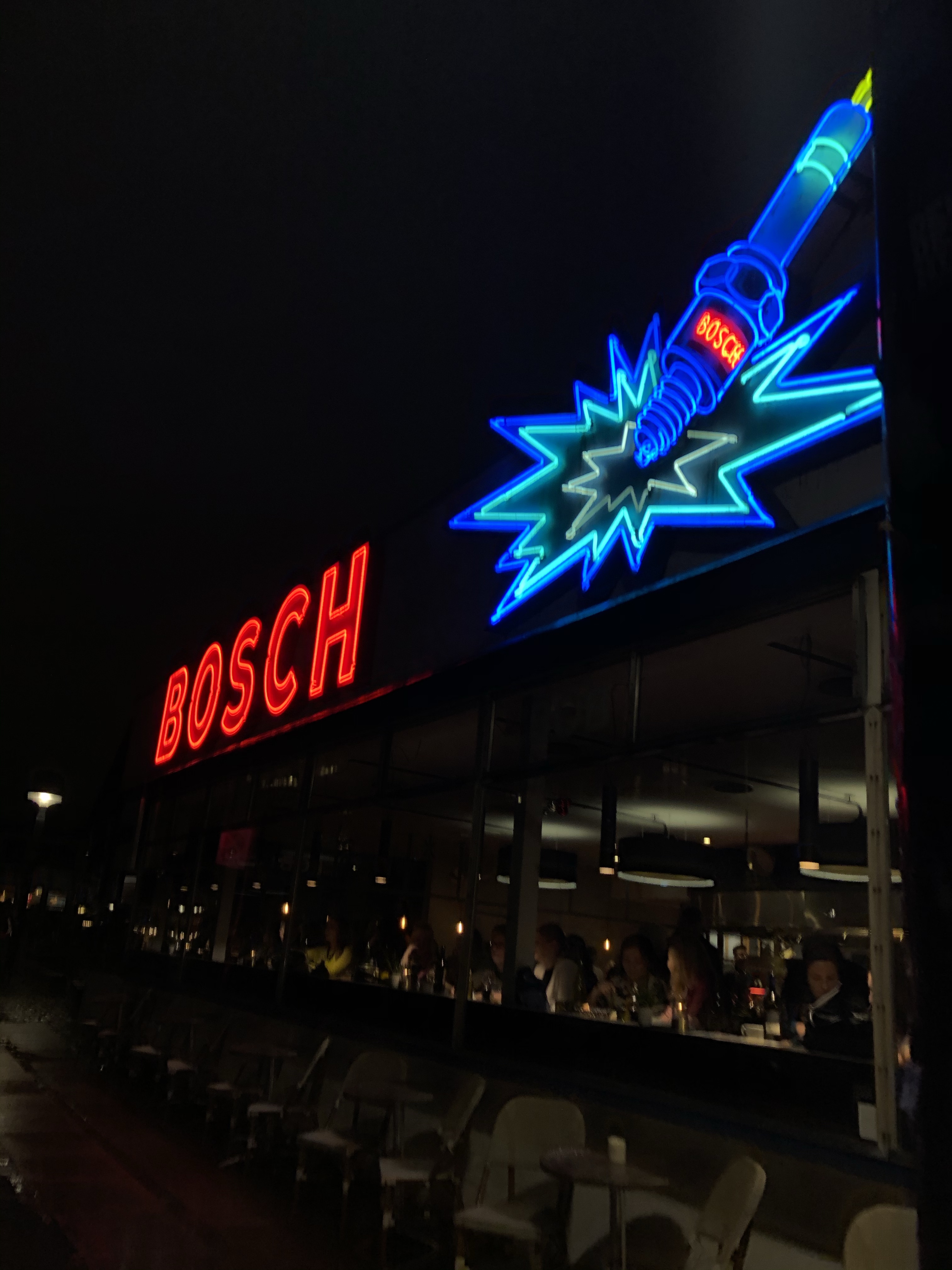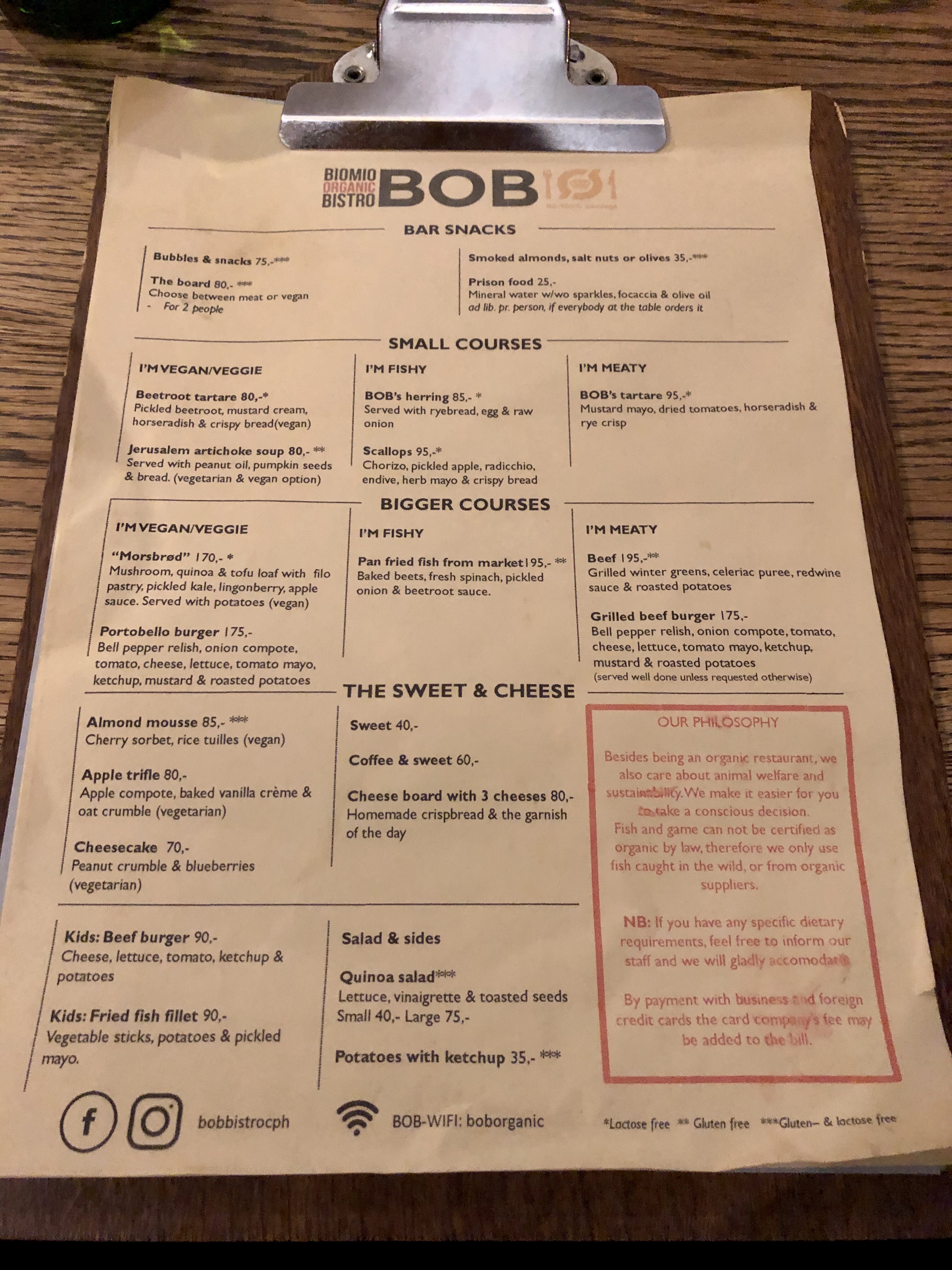 - BOB: Biomio Organic Bistro is located in the Meatpacking District, somewhere you can enjoy great food and drinks. You cannot miss this organic restaurant with the bright Bosch neon sign outside. We went here for drinks and a snack. For £10 we got a substantial sharing board with meat, crisps and a delicious dip. The open kitchen added to the great ambiance in the store and our server Rune made our visit enjoyable. The drinks were reasonably priced. Beer was about £6 and my cocktail (Bob’licious) was £8 which was reasonable. If we had time we would have returned for a meal because the burgers looks so good here.