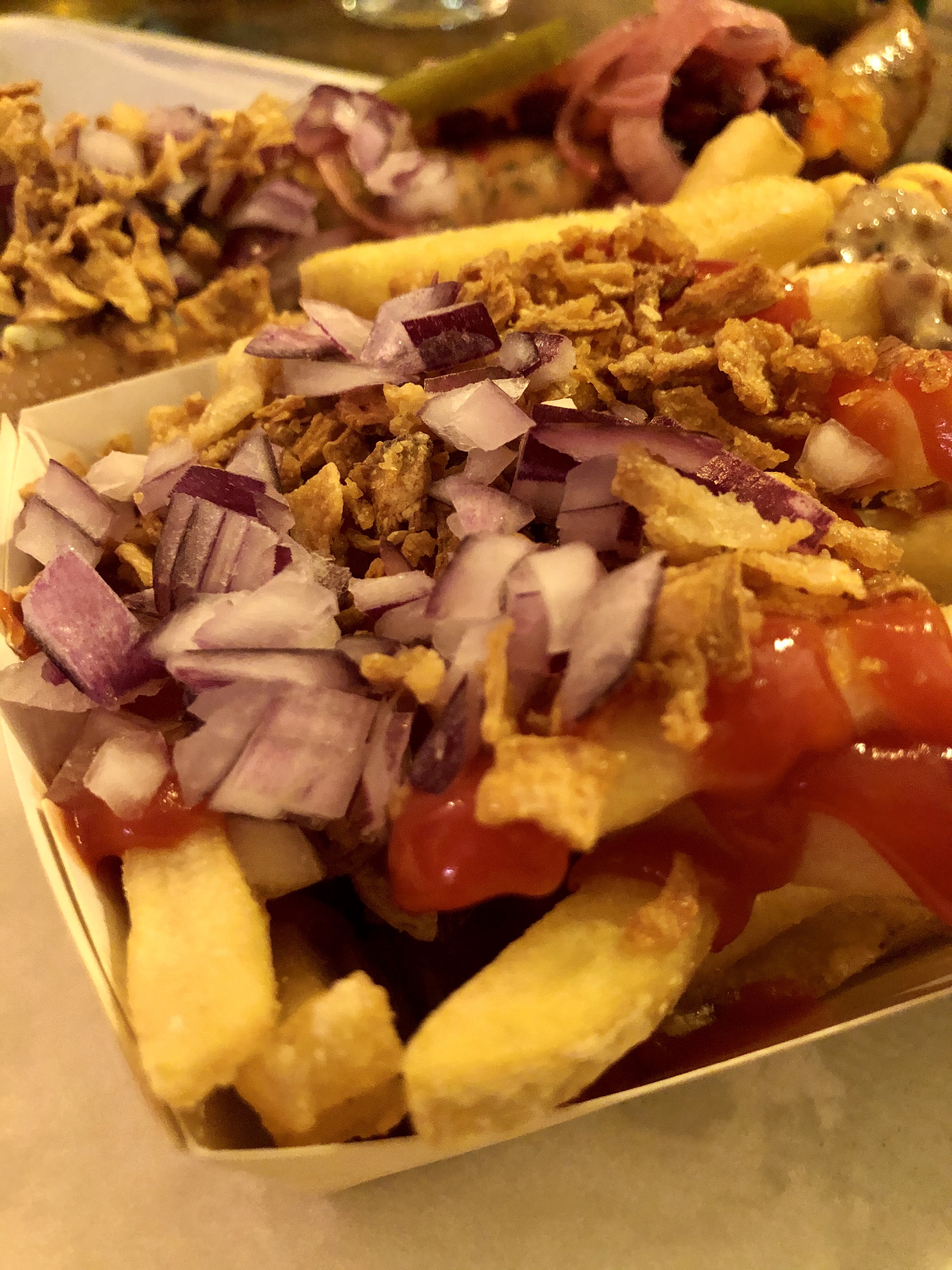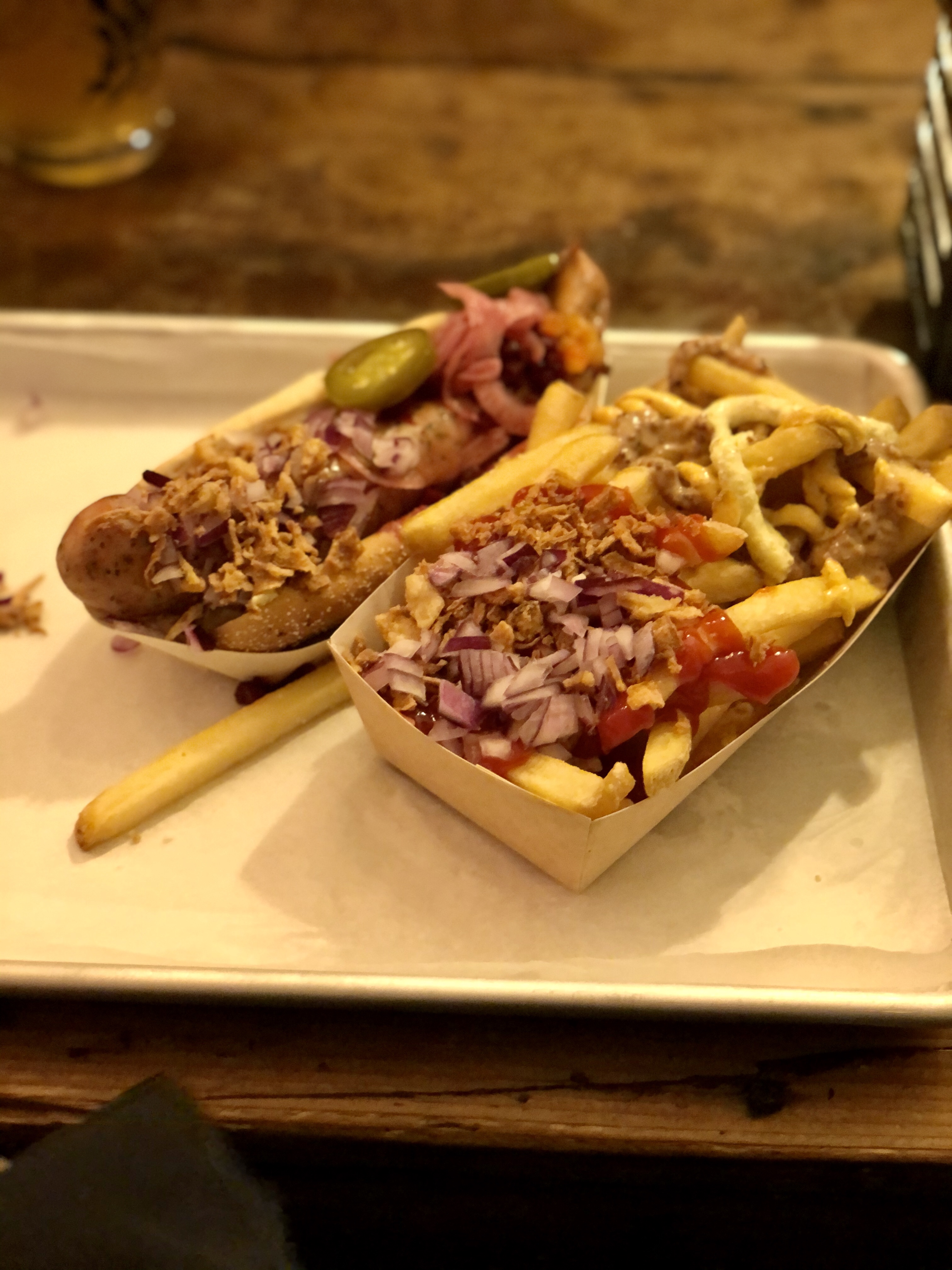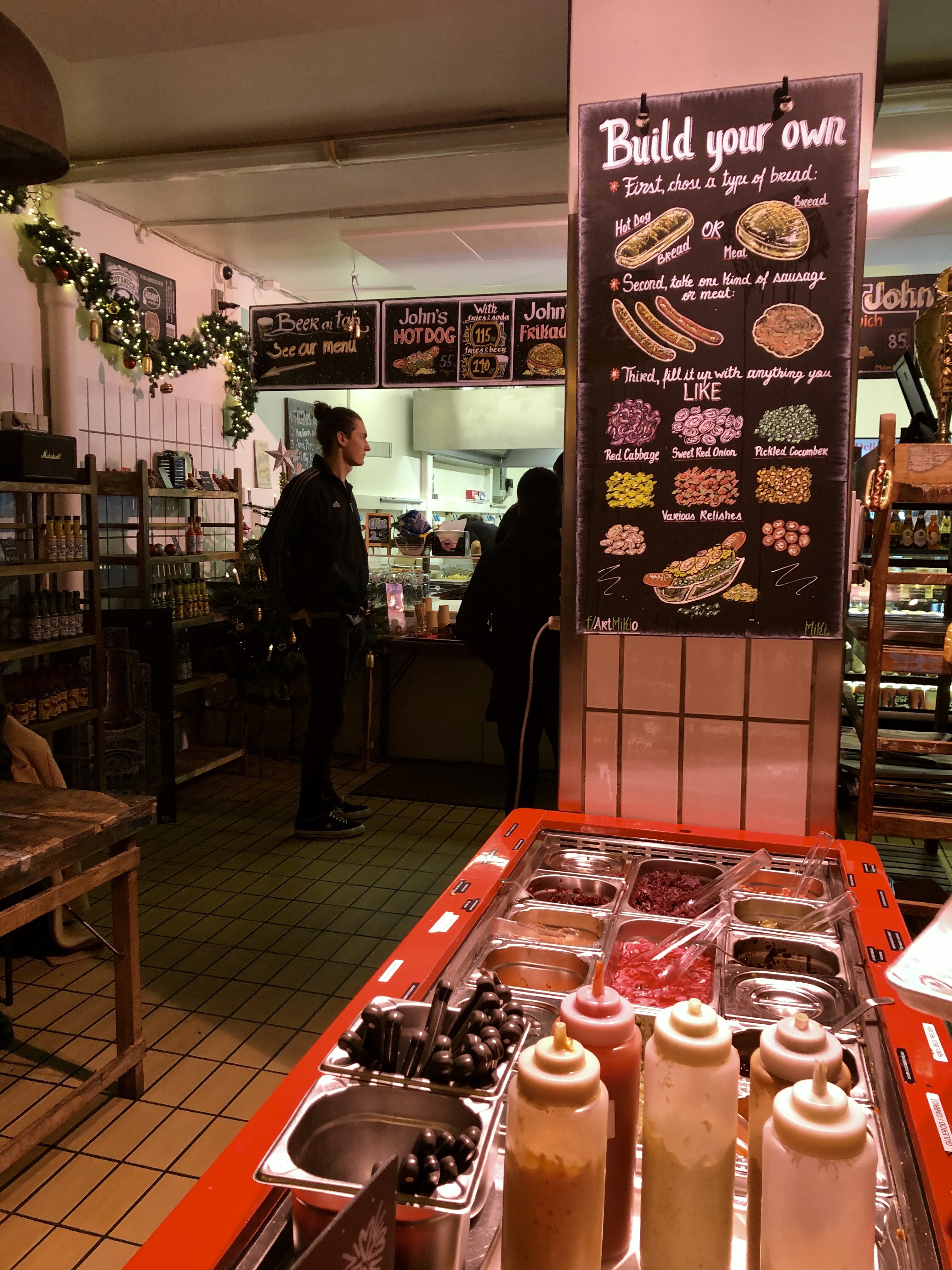 - Johns Hotdog Deli: Another restaurant in the Meatpacking District. Copenhagen’s best hot dogs are apparently at Johns Hotdog Deli. For £15 you can get a pimped up hot dog , fries and drink. The hot dog was delicious and being able to add unlimited topping was just a great idea. We loaded our fries too. The Deli served a range of hot sauces made in conjunction with Mikkeller beer if you wanted to spice things up.